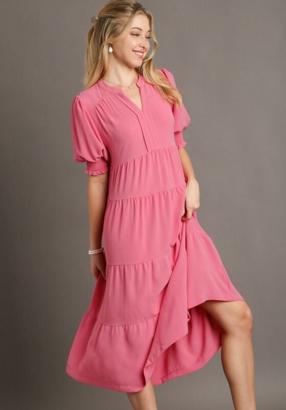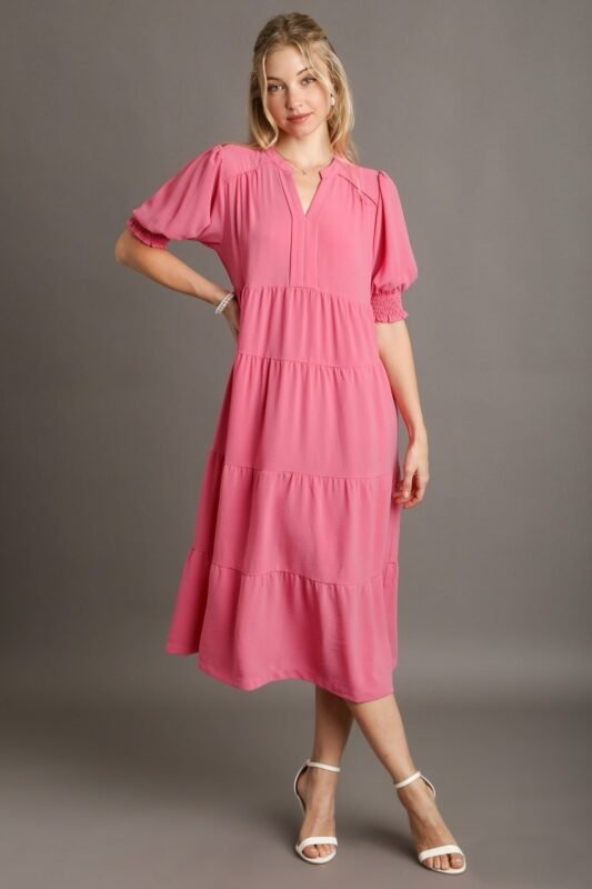 Umgee Solid Color A-Line Tiered Midi Dress with Piping Details in Rose Pink