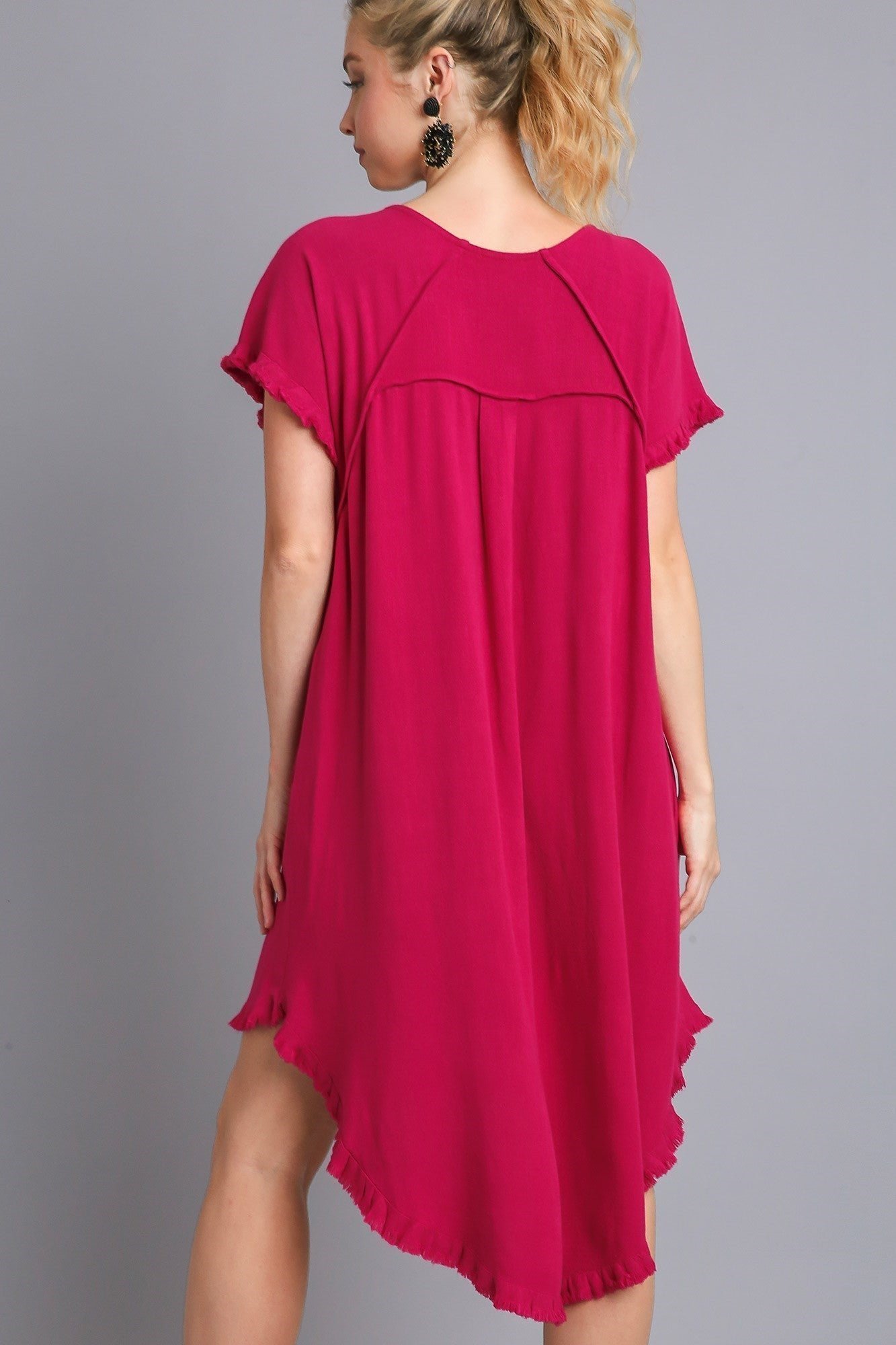 This is one of our most popular styles by Umgee!? It is an all-time best seller and a must have piece. This dress is a high low dress with frayed details . It features short sleeves with a round neckline. The best detail is the side pockets ! This flattering dress can be styled many different ways.? It would be great with a long kimono.? It is versatile enough to wear for many different occasions.